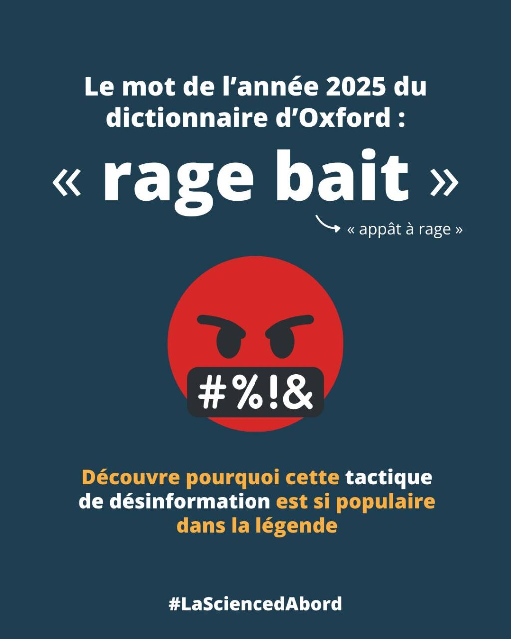 Le mot de l’année du dictionnaire d’Oxford est « rage bait » (appât à rage). Ce terme décrit du « contenu en ligne qui vise à susciter la colère ou l’indignation en générant de la frustration, en étant provocateur ou offensant, et qui est habituellement publié dans le but d’augmenter le volume du trafic sur une page Web ou sur les réseaux sociaux ».