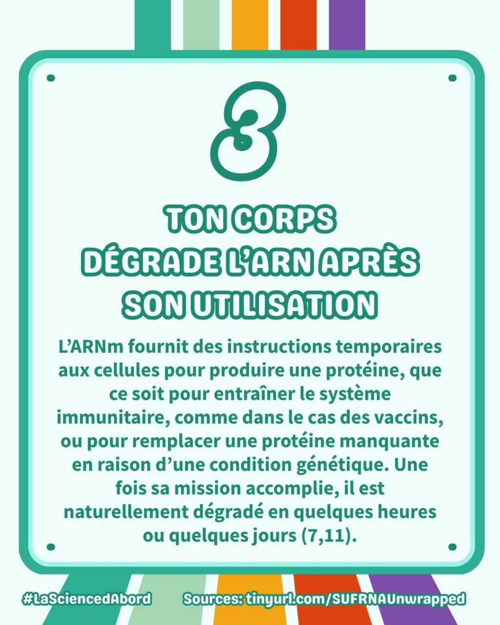 L’ADN contient toute notre information génétique et reste bien protégé à l’intérieur du noyau de la cellule. Il renferme les instructions nécessaires à la fabrication des protéines qui assurent le bon fonctionnement de notre organisme (par exemple l’hémoglobine qui transporte l’oxygène, ou l’insuline qui régule la glycémie). Comme les protéines sont fabriquées à l’extérieur du noyau, la cellule crée une copie temporaire des instructions nécessaires. Cette copie, appelée ARN messager (ARNm), transporte l’information du noyau vers le cytoplasme afin de permettre la production de la protéine. Une fois son rôle accompli, l’ARNm est rapidement dégradé par la machinerie cellulaire avant d’être recyclé (8,9).