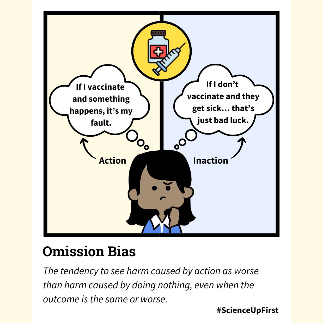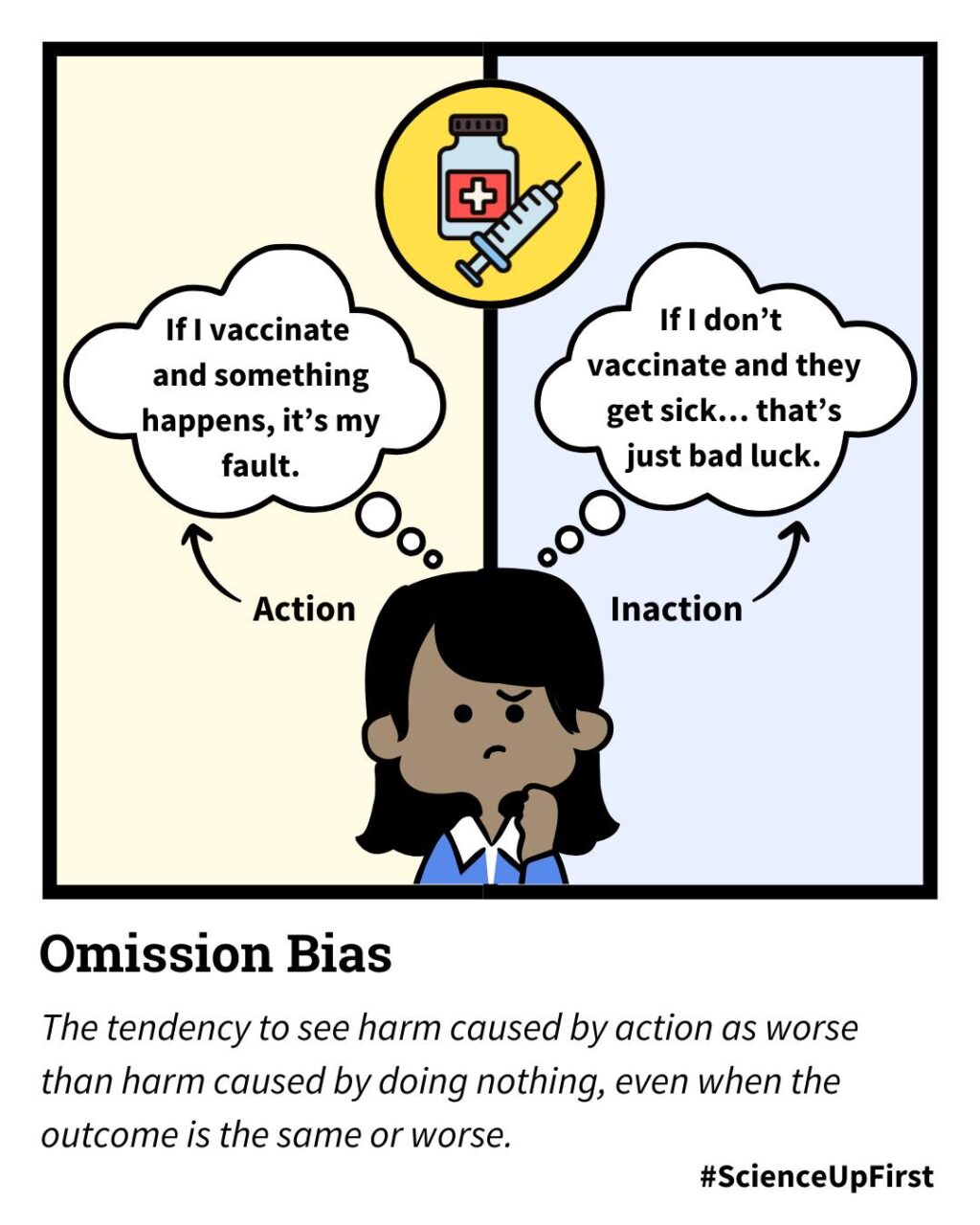 We see this often with vaccines. For a hesitant parent, vaccinating can feel like pulling the lever. It is an active choice (1). Vaccines are incredibly safe, and most side effects are mild and short lived. Serious reactions are rare (4). But if something were to happen, it can feel like it happened because of a decision they made. Choosing not to vaccinate can feel safer because it avoids action, but it does not remove the risk (1,5). In fact, the risk of severe illness, complications, or death from vaccine-preventable diseases is significantly higher than the risk of serious vaccine side effects (6).