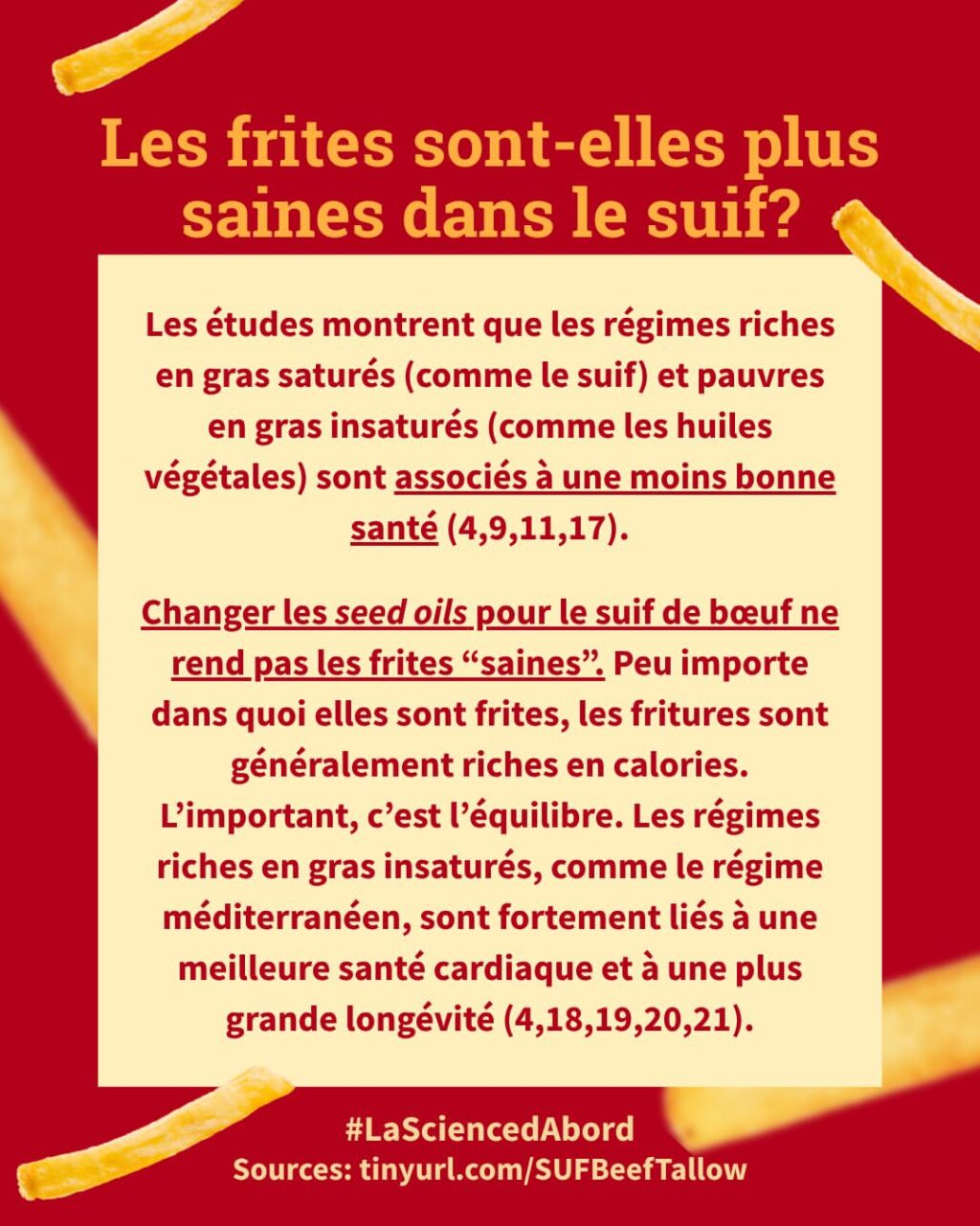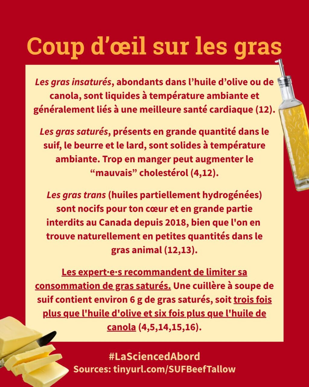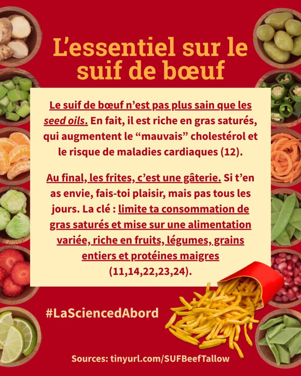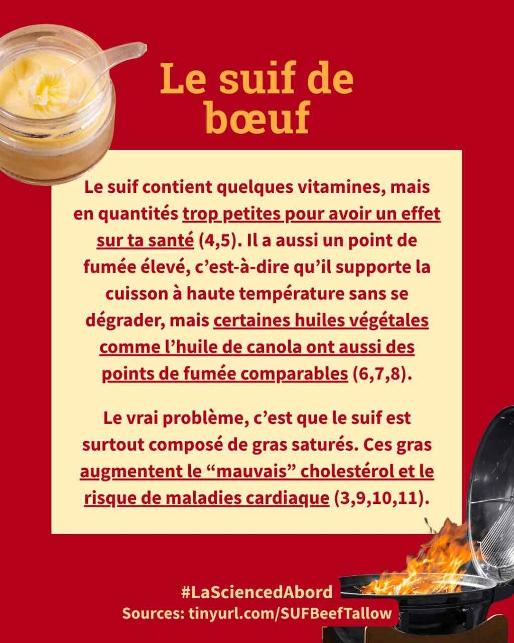 Réponse courte : non. Le suif de bœuf est riche en gras saturés, qui augmentent le taux de « mauvais » cholestérol et les risques cardiaques.
