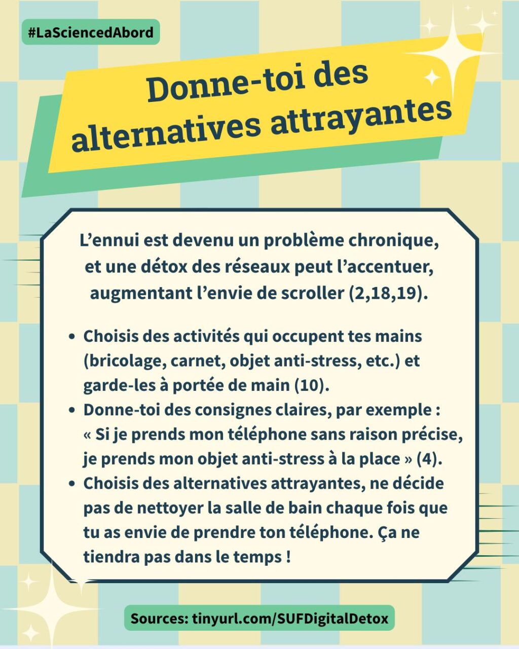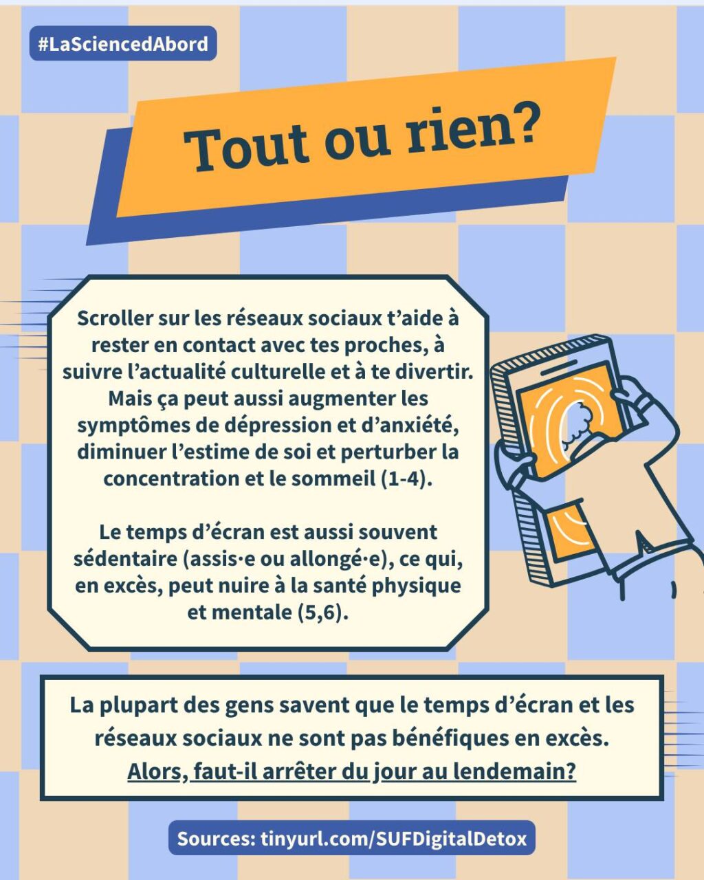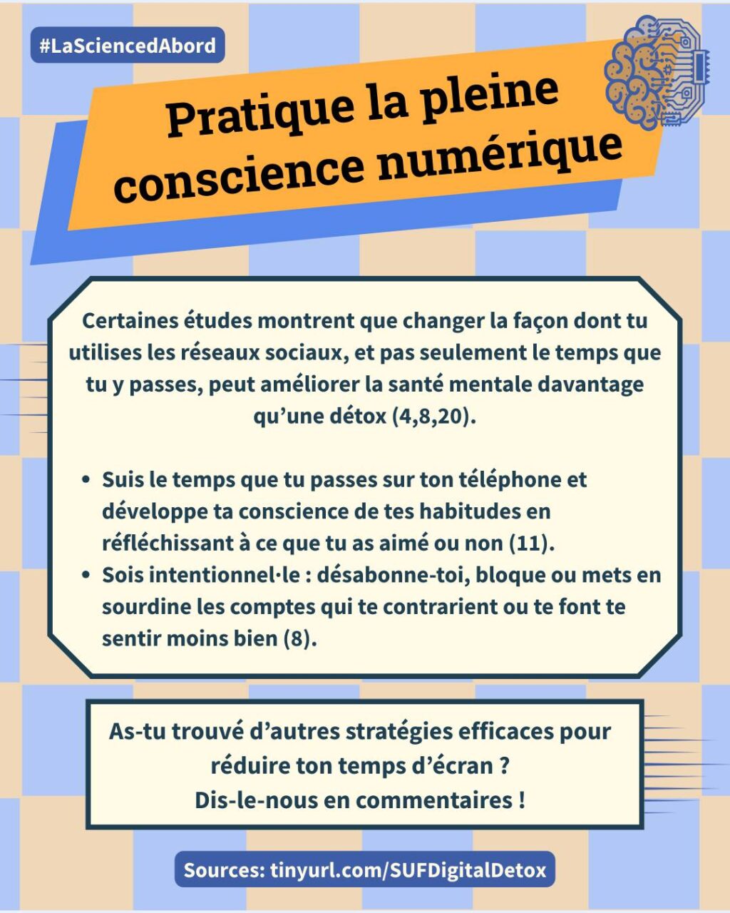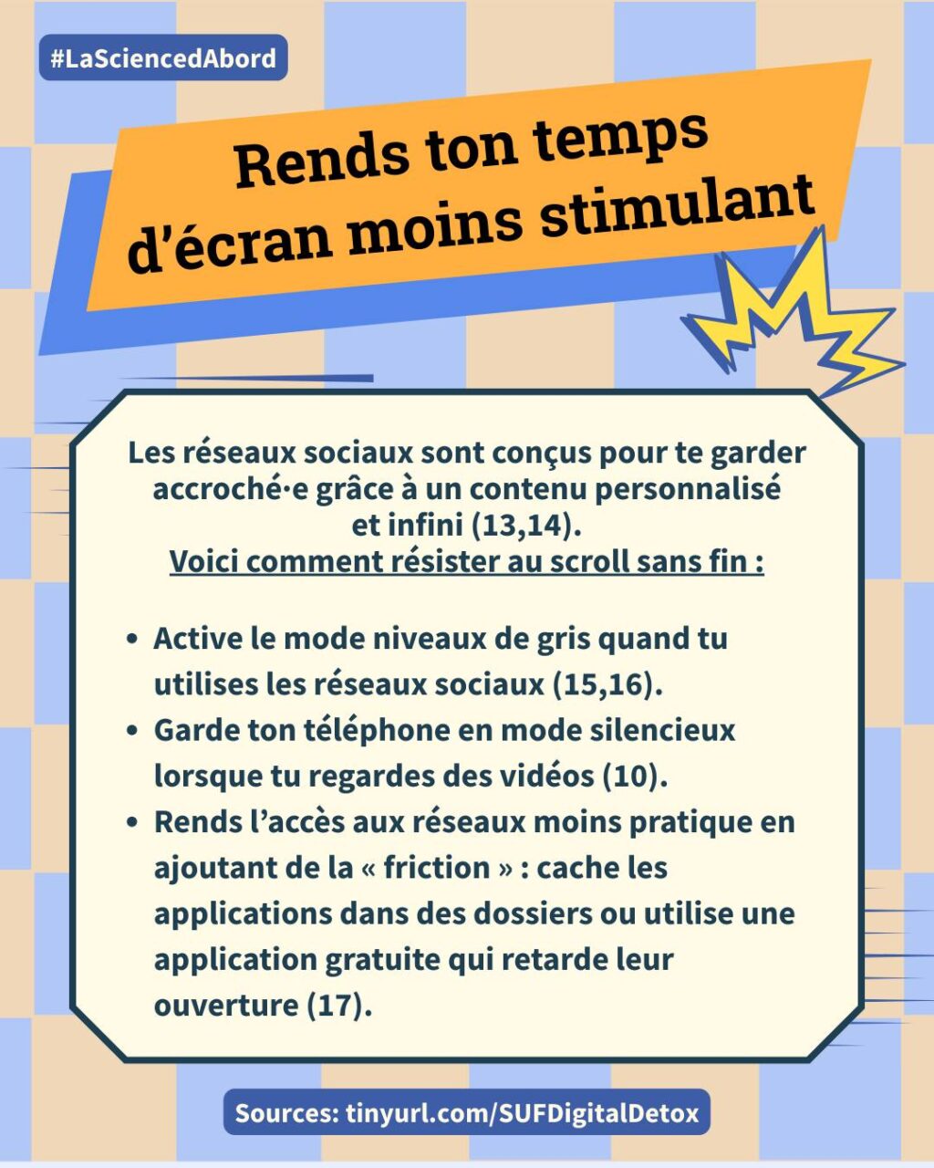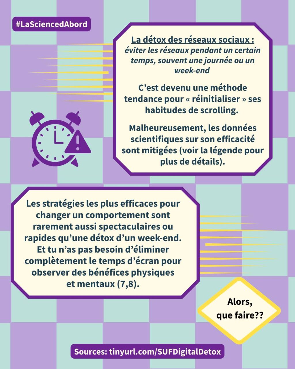 Tu as peut-être vu des affirmations percutantes sur les bienfaits d’une « détox des réseaux sociaux ». Mais les résultats scientifiques sont mitigés. Certaines études montrent de légères améliorations des symptômes de dépression et d’anxiété, du bien-être et de la qualité du sommeil pendant la détox (2,7,20-23).