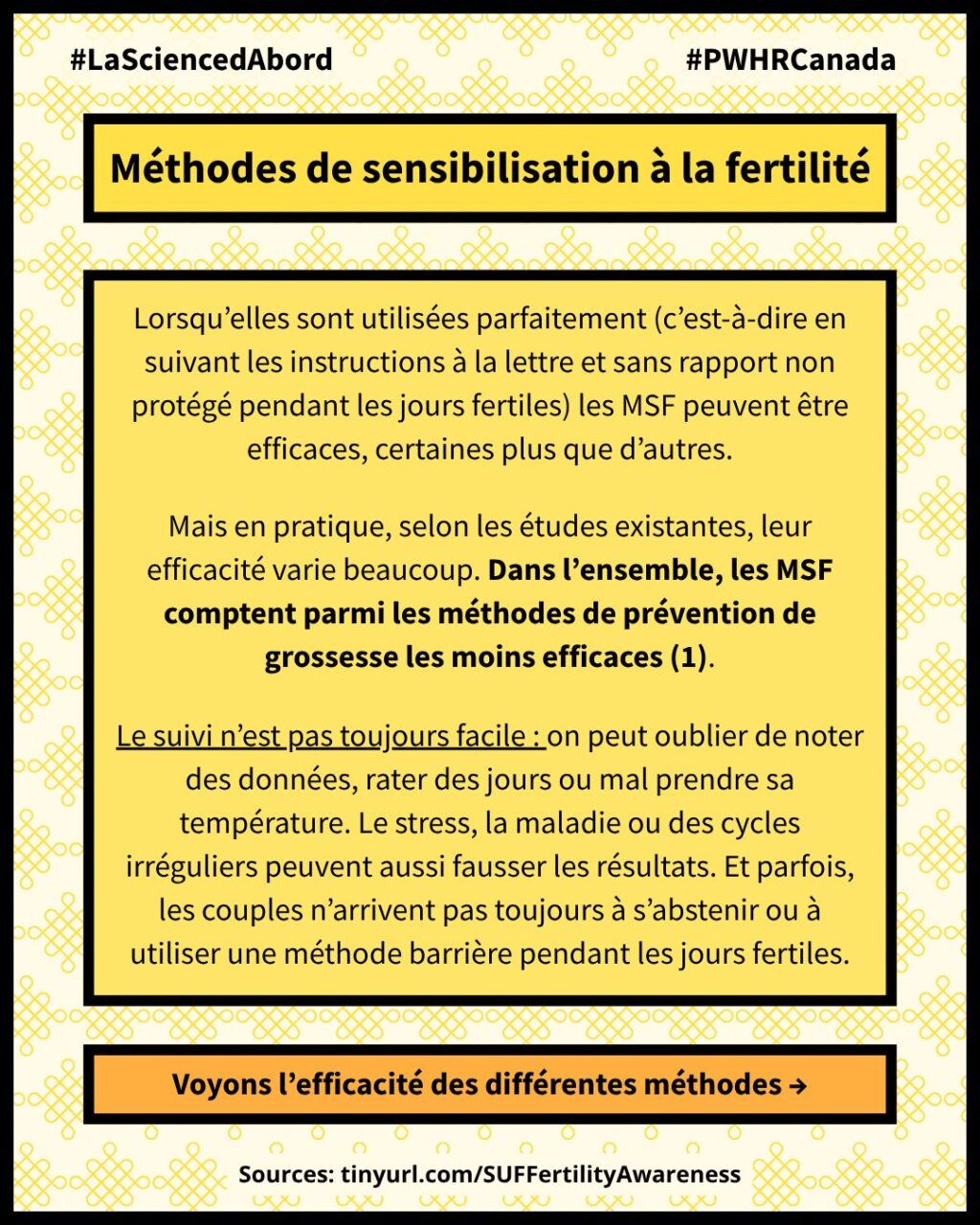 Dans la vie réelle, les rapports sexuels ne sont pas toujours prévisibles, les préservatifs peuvent se déchirer, vous pouvez oublier de noter vos symptômes un matin ou ne pas avoir de méthode contraceptive à portée de main. Parfois, il existe même des obstacles plus sérieux, comme la pression exercée par le partenaire ou la violence. C’est pourquoi les experts en santé publique se concentrent généralement sur l’utilisation typique : comment une méthode fonctionne pour la plupart des gens dans des situations quotidiennes. Cependant, si vous êtes curieux, vous trouverez ci-dessous les statistiques relatives à une utilisation parfaite (lorsque tout est fait exactement comme il faut).