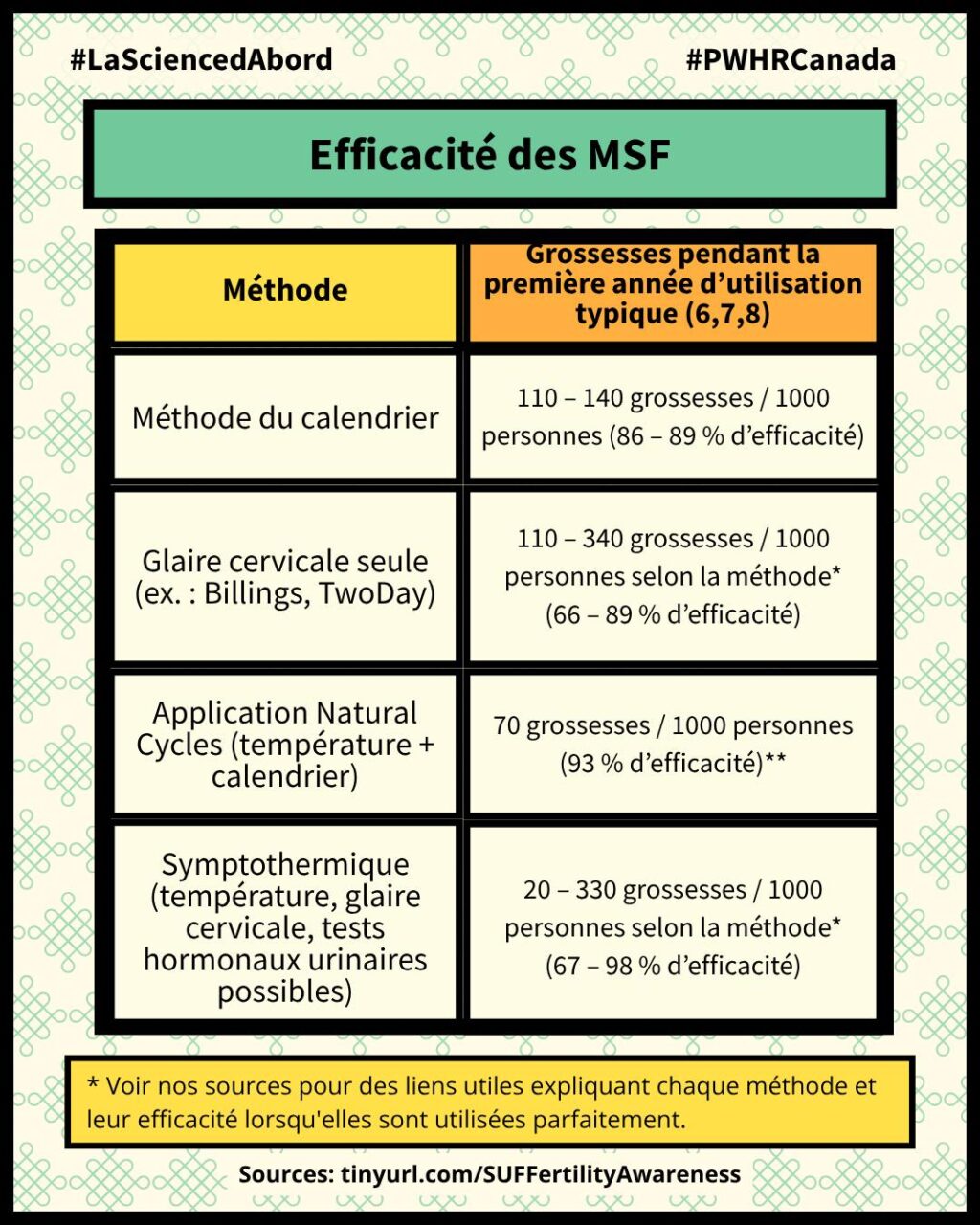 | Symptothermique (température corporelle, glaire cervicale et éventuellement contrôle hormonal urinaire) | Moins de 10 grossesses pour 1 000 personnes(efficacité supérieure à 99 % pour les méthodes Sensiplan et Marquette) |