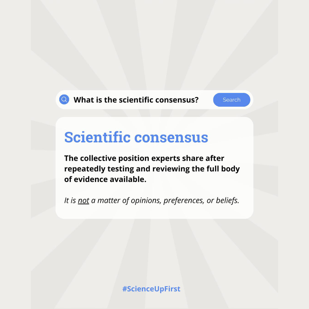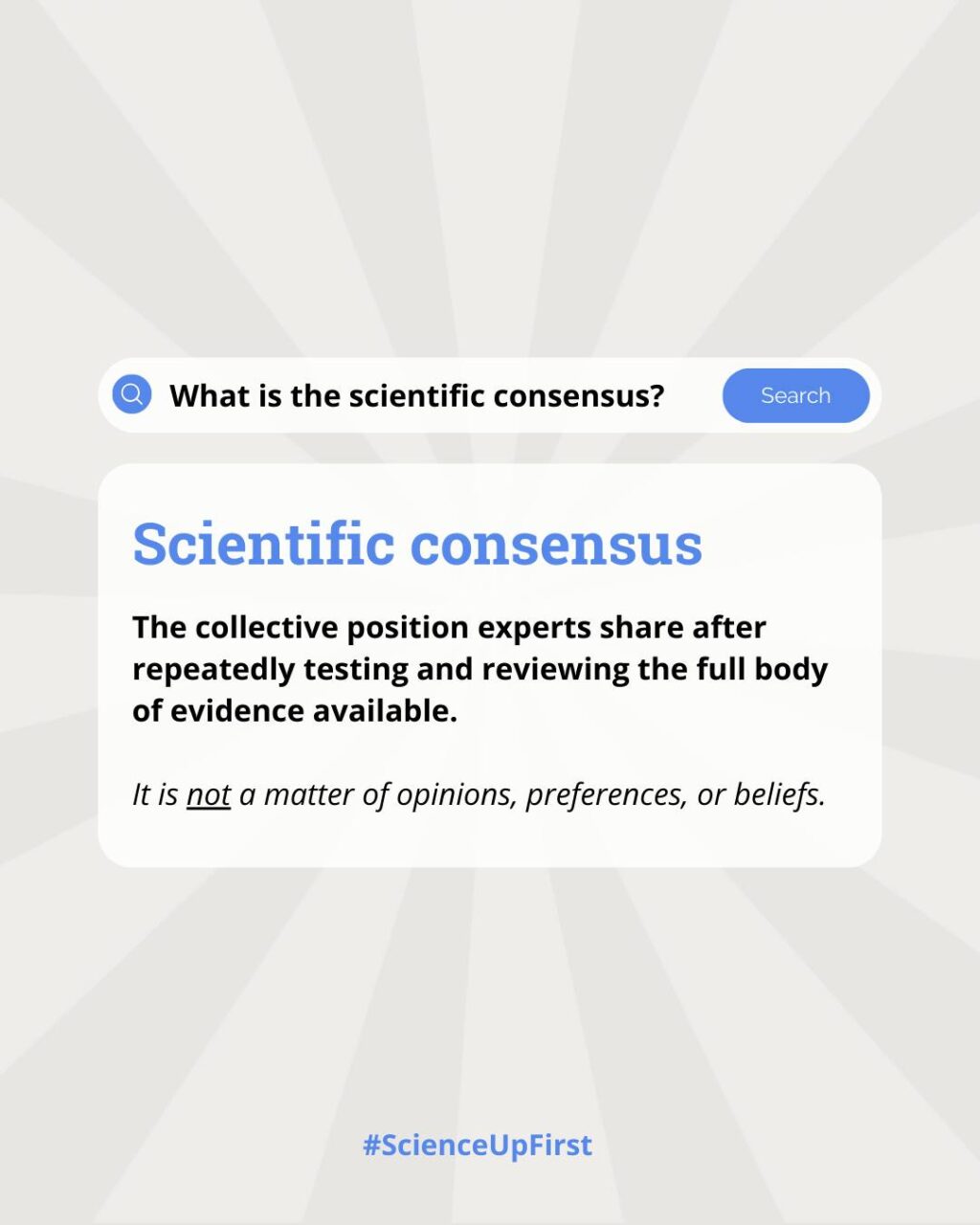 Reaching a scientific consensus takes time and a lot of evidence. That is why there isn’t a consensus on every topic (19). The scientific consensus should always remain open to challenge. But overturning a well-established consensus requires strong evidence, as it would imply that the data, experiments, and conclusions of many were misinterpreted by the majority of experts in the field (6).
