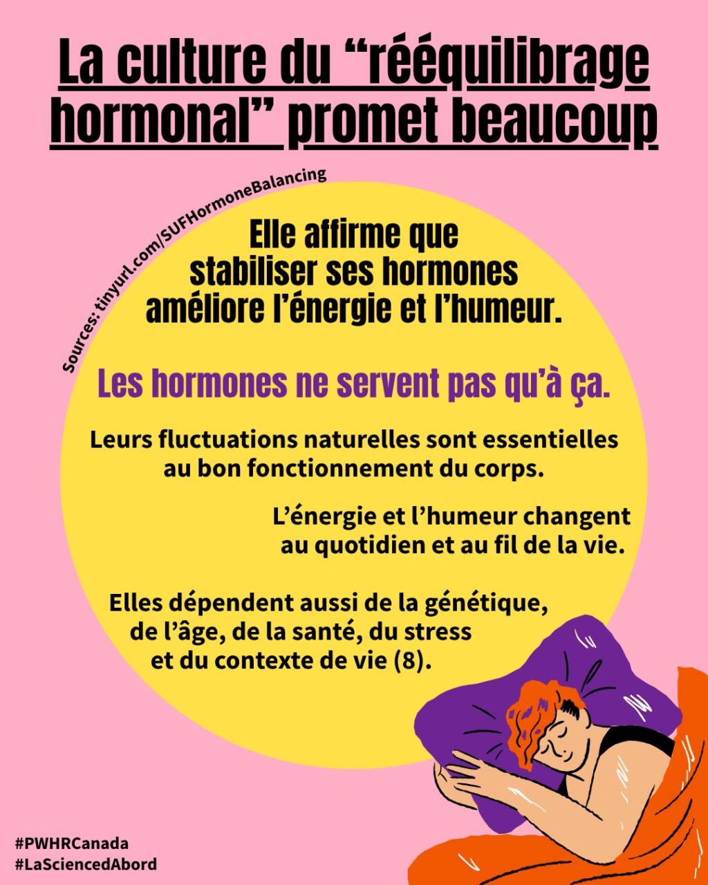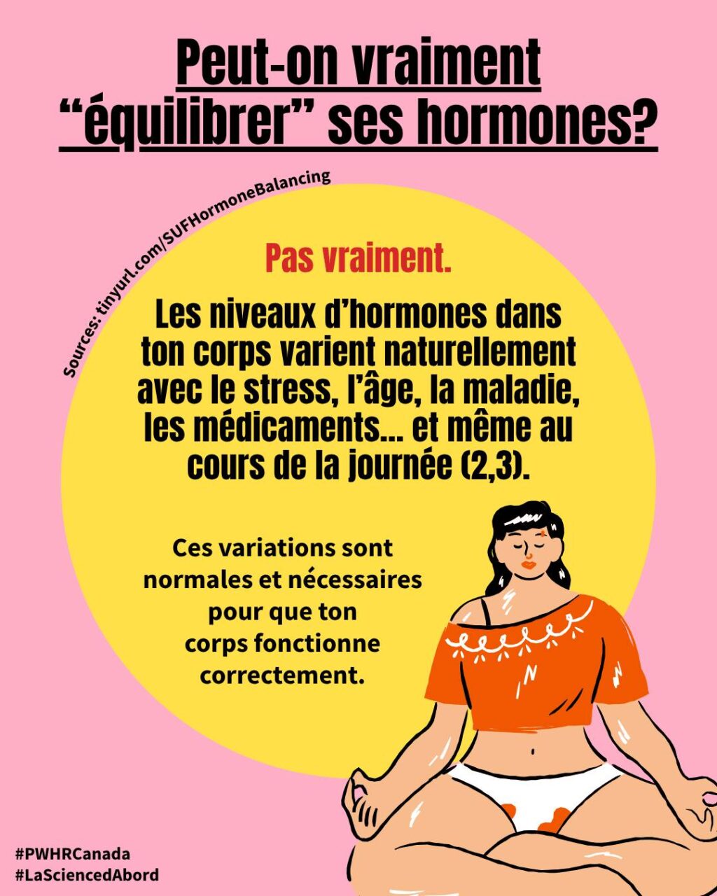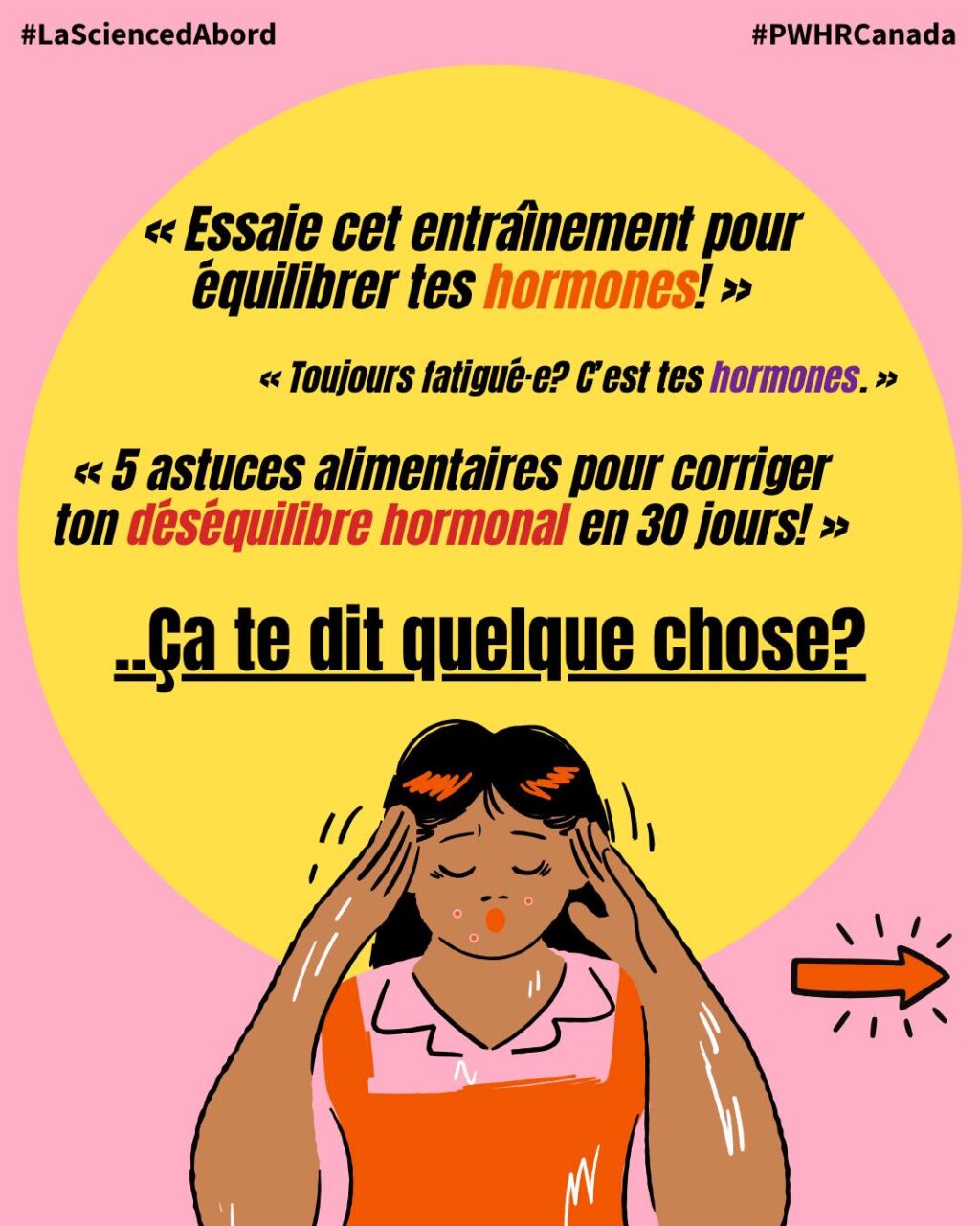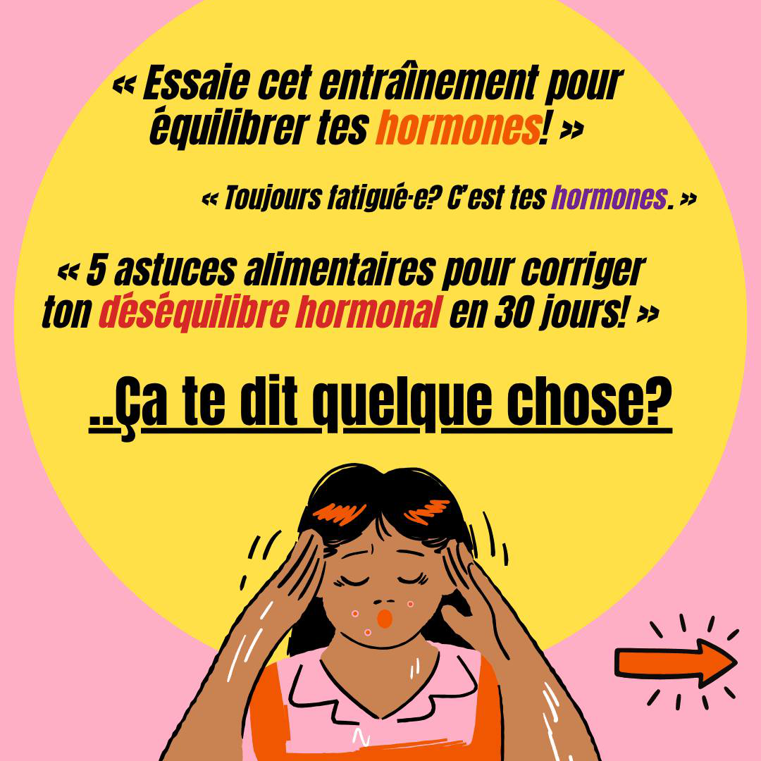 Tu vois plusieurs influenceur.euses qui affirment que tous ces symptômes sont dus à un « déséquilibre hormonal » et que si tu achètes tel suppléments ou que tu suis tel régime alimentaire, cela « rétablira l’équilibre » et tes symptômes disparaîtront.