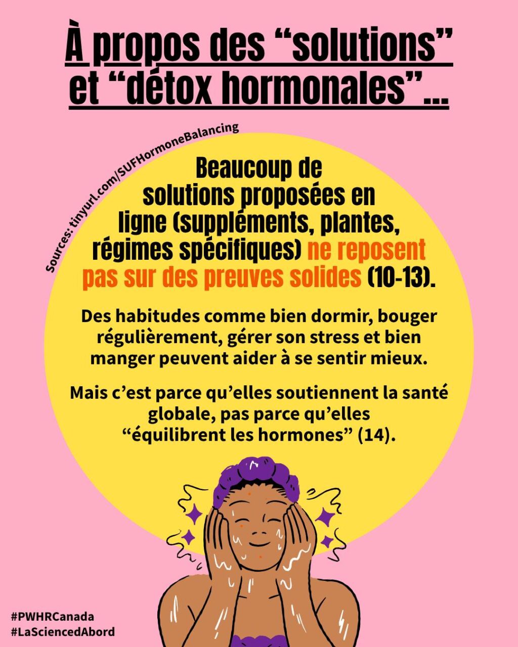 Bien que tu devrais absolument consulter un.e professionnel.le de la santé pour déterminer l’origine de tes symptômes, surtout s’ils persistent, les « cures hormonales et détox » promues en ligne ne sont souvent qu’un moyen de vendre un traitement dont l’efficacité n’a pas été prouvée.