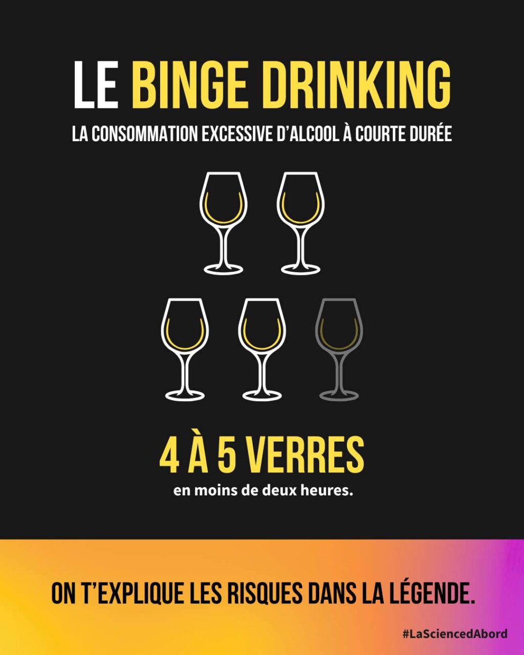 La consommation excessive d’alcool (binge drinking), c’est quand on boit une grande quantité d’alcool sur une courte période (souvent en environ 2 heures), ce qui peut faire monter le taux d’alcoolémie à 0,08 % ou plus. À ce niveau-là, on est légalement considéré·e comme en état d’ébriété.